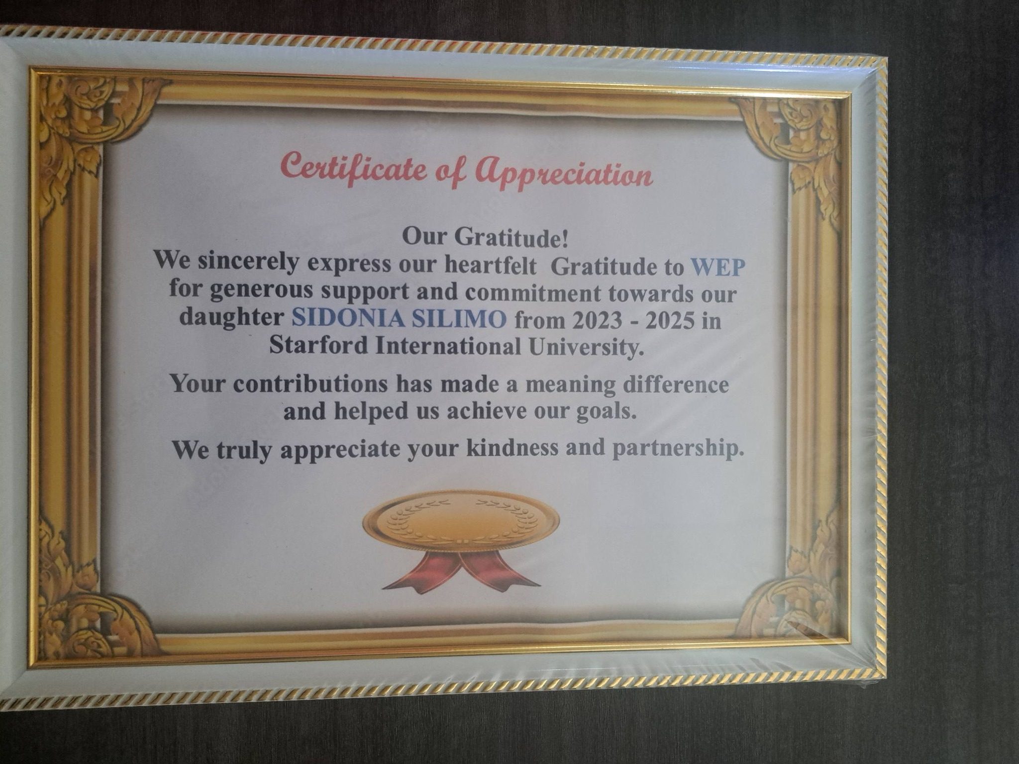We were pleased to receive Ms. Sidonia Silimo, one of our first WEP sponsored students, who recently graduated with a bachelor degree in International Relations at Starford International University in South Sudan. Sidonia and her family came to our office in Juba to express their gratitude to WEP for supporting her education and presented us with this certificate:
